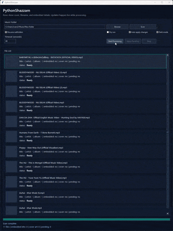 The Python GUI version was built so that instead of a stream of text, you get a living list of your files with cover, name, embedded metadata, and status - all visible at once. You can scan first, inspect what already exists, see what Shazam proposes, and choose how changes are applied. The app now supports two mindsets: instant write (Auto apply) or review-first (Pending apply then commit). You can scan per file by selecting it and right click.